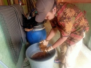 - Setelah itu drum diisi air sebanyak 120 Lt.Caranya sebagai berikut: Setelah molase dan air dimasukkan,kemudian buah yang sudah dipotong-potong,dicampur kedalam drum sambil diaduk menggunakan tongkat.Setelah cukup diaduk,kemudian drum ditutup dengan plastik yang diikat dengan karet ban.Selama 3 bulan kedepan drum tidak boleh terkena sinar matahari secara langsung,dan eco-enzym siap dipanen.Teknik pengubahan sampah organik menjadi eco-enzym berperan penting dalam mengurangi banyaknya sampah organik yang berakhir di TPA.